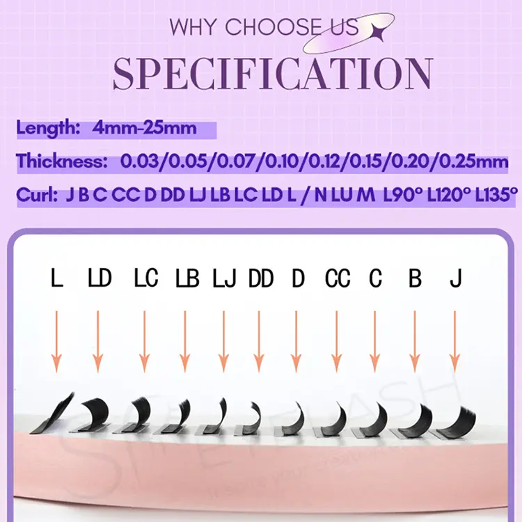 SP Eyelash Lash Extension Supplies tilbyder en bred vifte af krøllmuligheder, herunder J, B, C, CC, D, L og M, der er egnet til forskellige øjenformer og ønskede makeup -effekter. Fra subtile og naturlige krøller til dramatiske og fængslende krøller er alt tilgængeligt.